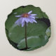 Het afbeelding op dit Ronde Kussen is een originele foto van MaeFlowers van een waterlelie, een bloeiende bloem te midden van de leliepads die op het water zweven. De bloem is een mooie lavendelblauwe kleur, die zich onderscheidt van de donkergroene, ronde lilypads.