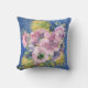 Een verstuiving van waterverf bloemen in tinten blauw, lavender, roze en violet wordt ondersteund door penseelstreken van metallisch goud en een rijke donkerblauwe achtergrond. De rechterrand heeft een dunne lijn van blauw glitter om een aanraking van whimsy toe te voegen. (Als je liever de kussen zonder de glitter wilt, voel je vrij om me te berichten op Zazzle.) De achterkant is een rijk blauw op blauw abstract ontwerp.