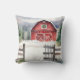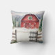 Rode schuur met groene kerstkrans en rustieke oude omheining in sneeuwvlokken.