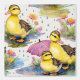 Waterverf baby wilde eendjes watten in de regenplassen met een roze paraplu en bloemetjes.