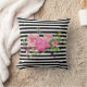 decorateur gooien kussen gedaan zwart en wit horizontale gestreepte achtergrond. Prachtig waterverf kunstwerk, van een roze pioenenboeket, versiert het midden van het kussen.