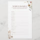 Laat je vrijgezellenfeest bloeien met plezier en opwinding met onze Waterverf Wildflower Bridal Word Scramble Game! Dit prachtige bruids woord scramble spel zal vreugde en lach brengen op uw speciale dag! Kijk hoe je bruidsfeestje en gasten samenkomen in groepen of solo werken om de bruiloft-thema woorden op elke prachtig ontworpen kaart te ontwarren. De eerste die de verwarde woorden correct ontcijfert, wint! Het is de perfecte activiteit voor je boho vrijgezellenfeest waar iedereen glimlacht. Plus, het mooie waterverf bloemwerk maakt het een aandenken dat ze willen vasthouden. Geef je gasten een leuke en onvergetelijke ervaring met dit must-have vrijgezellenfeest spel!