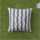 Een klassieker met een twist, luchtig en fris, het originele kunstwerk van ZoeSPEAK op dit zomerse Outdoor Pillow is een algemeen patroon van donkerblauwe en natuurlijke witte canvas strepen, sommige breed en sommige dun. In het midden van het ontwerp zijn de strepen golvend, geribbeld als water, waardoor de stof een al gerimpelde look krijgt.