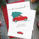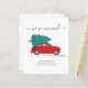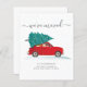 We hebben de aankondiging van de kerstvakantie verplaatst met een rode auto en kerstboom met script en populaire typografie op witte achtergrond.