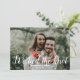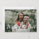 Voeg een leuke foto toe van de speciale dag, toen de tijd goed was en de rechtbank om de hoek zat. Deel het goede nieuws met je familie en vrienden. Op de achterzijde is een mooie oranje bloemachtergrond te zien. Foto van Placeholder: Rae Hobins van Unsplash, bedankt!