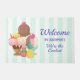 Een leuke welkomstdeurmat met een ijsthema dat zegt: we zijn de coolste. Geïllustreerd met een tekening van een 3-scoop ijszonde met kleurrijke strooisel. Een ijskegel met schep chocolade, aardbei en vanille. Een kom neopolitaans ijs met een kers erop. Aardbeien en een ananasvrucht zitten naast de kommen. Zomer en zoet. Een muntgroen en wit streepjespatroon op de achtergrond.