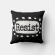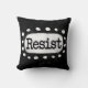 Vetgedrukte tekst met de tekst "Resist" is gecentreerd tegen een zwarte achtergrond. De zwarte tekst bevindt zich op een witte rechthoek met grote getextureerde witte stippen eromheen, wat een speels contrast biedt tegen de achtergrond van de effen kleur.