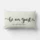 Moderne trendy scriptkalligrafie met hart bloeit het lezen van "Wees onze gast" op deze elegante zwarte en ivoorlendenwervel gooit kussen, perfect om gasten thuis, vakantieverhuur of bed en ontbijt te verwelkomen.
