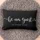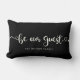 Moderne trendy scriptkalligrafie met hart bloeit het lezen van "Wees onze gast" op deze elegante zwarte en ivoorlendenwervel gooit kussen, perfect om gasten thuis, vakantieverhuur of bed en ontbijt te verwelkomen.