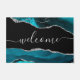 Maak kennis met uw gasten in stijl met deze gepersonaliseerde blauwgroen, zwarte en zilveren glitter agate doormat met de groet "welkom" in de hand geschreven moderne faux Silver scriptkalligrafie. Maakt een elegant huisverwarmingsgeschenk voor die speciale vriend in je leven.