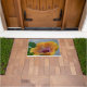 Een Doormat voor de voorkant van je huis, met een foto van een gele Hibiscus bloem en het woord Welkom.