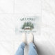 Verwelkom uw gasten in uw familiecabine met deze gepersonaliseerde rustieke winterdeurmat met een hut genesteld in de bossen, met besneeuwde pijnbomen.