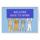 Een rij van verschillende cartoon katten die op hun rug staan. De katten houden een teken achter dat zegt: "Welkom terug op het werk". Het afbeelding heeft een blauwe achtergrond.