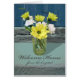 Welkom Thuis vanuit het ziekenhuis, Bloemenarrangement. Papieren wenskaart is voorzien van een digitaal schilderij van gele madeliefjes en witte anjers gerangschikt in een glazen pot en zittend op een cementstap. Een blauwe houten poort vult de bovenste achtergrond. Kunst, afbeelding en vers copyright © Shoaff Ballanger Studios.