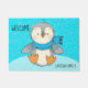 Zoete pinguïn kunst. Een gepatterde blauwe achtergrond. Aangepaste klepmat met aanpasbare tekst. Opties voor wijzigingen in welkomsttekst en familienaam. Snelle en gebruiksvriendelijke sjabloon.