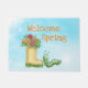 Welkom Voorjaarsklep Doormat. Een schattige kleine groene staartwapier en een regenboogplanter.