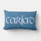 Een leuke lumbale kussen met het Welsh woord 'cariad' in een Keltisch script, gevuld met een floreel patroon geschetst in helder blauw op een diepe blauwe achtergrond. Perfect geschenk voor degene van wie je houdt!