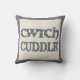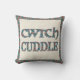 Een stijlvol Sierkussen of kussen, met de woorden 'knuffel' en 'cwtch' (Welsh voor 'knuffel' of 'knuffel'), opgevuld met een geometrisch patroon in donkerrood en donkerblauw.