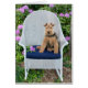 schattige Welsh terrier zittend op witte rieten stoel in rhododendron tuin voor het denken aan je