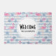 Welkom doormat met een patroon met een leuk summiere blik. Roze flamingos en ananas, ingesteld op een lichtblauw gestreept patroon met bladeren en harten overal rond.