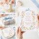Design Elements: Hand-drawn botanicals, dainty blue ribbon bow, and celebratory icons.