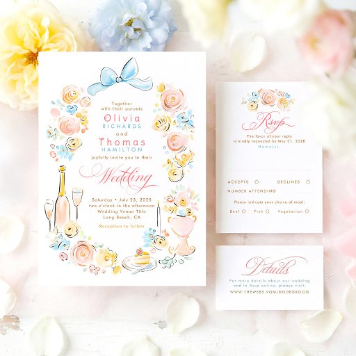 The whimsical layout is rich with bespoke illustrations, including chilled champagne, a celebratory tiered cake, and a vintage-style Rococo flower vase. These artistic details evoke the sophisticated atmosphere of an intimate garden party or a chic coastal gathering.