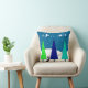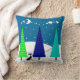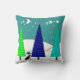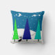 Retro kerstbomen en Cat Pillow Pillow, drie artsy retro bomen in schaduwen van blauwgroen en blauw op een donkerder blauwgroen en blauwe achtergrond. Bomen geschetst met sneeuwheuvels en zwarte kat. Achterkant van kussen in coördinerende kleuren maar achtergrond is een lichtere blauwe/groene kleur.
