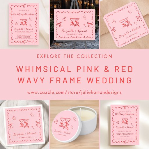 Celebrate your special day in charming, modern style with this pink and red wedding reception invitation featuring playful hand-drawn illustrations and fun script and lettering. Toasting wine glasses, bows, a heart and delicate accents add a festive touch, making it perfect for couples hosting a joyful reception celebration. The scalloped wavy border frame creates a unique, eye-catching design that feels both classic and fresh. Personalize with the names of the bride and groom, reception date, venue details, and RSVP information. Whether you’re planning a formal event or a casual gathering, this design complements a wide range of wedding themes—from modern minimalist to classic romance. NOTE: This budget-friendly paper is similar in weight to photo paper -- a larger and thicker 5x7 traditional card stock version is also available (message us for the link).
