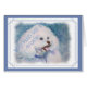 Just the Sweetest Bichon Frise puppy – so fluffy and pure white with a blue-purple colour on a blue background. The Cutest pink panting tongue. For all or any occasion – make your own statement and be unique and remembered for your thoughtfulness. Originally painted by the designer – contact me if you want your pooch painted!