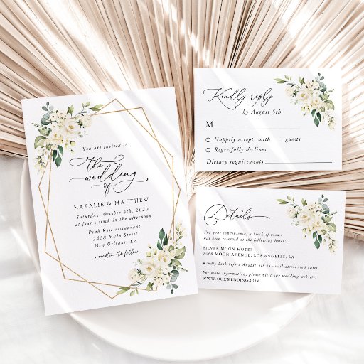 Voeg een persoonlijk tintje toe aan je trouwfeest met deze stijlvolle en gedenkwaardige feestartikelen! Het ontwerp is voorzien van witte waterverf bloemen, groen en gouden lijst op witte achtergrond.