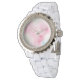 Een elegant polshorloge met delicaat geverfde witte kant tegen een waterkleurig visueel vlak.
