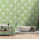A symmetrical palm tree pattern featuring white etched-style palms set against a soft green background. The arch-like layout and subtle hand-drawn texture give the design a breezy, relaxed feel.