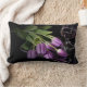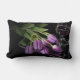 Glas wijn en paarse tulpen op zilveren dienblad op zwart.