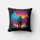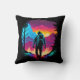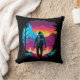 Een koele retro stijl kleurrijke berglandschap ontwerp met een wandelaar in de zonsondergang.