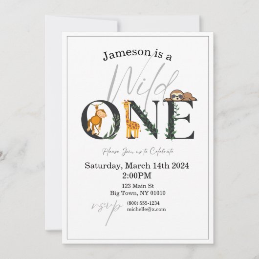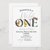 Nodig vrienden en familie uit voor het verjaardagsfeestje van je Wild One! Eerste verjaardagsuitnodiging met Aap, Giraffe, Sloth Oerwoud Theme.