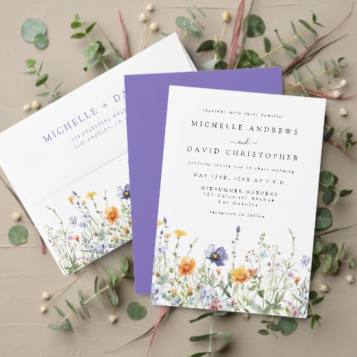 Dit ontwerp heeft een kleurrijke rand van waterverf wilde bloemen in tinten van paars, goud, groen en blauw.