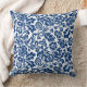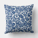 Drijf kussen in een William Morris-filmdamaspatroon, digitaal versterkt en gekleurd, in diep kobalt blauw op een witte achtergrond