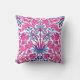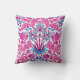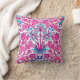 Gooi kussen in een William Morris-patroon van hyacinten, tulpen en bladeren, in tinten van fuchsie en zacht roze, voorzien van donkerblauw en turquoise, op een witte achtergrond