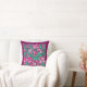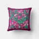Pillow in a William Morris, Art Nouveau, textielprint van irissen en bladeren, digitaal versterkt en gekleurd, in fuchsia en ijsroze, pauw groen en wit, tegen een achtergrond van diepe wijn