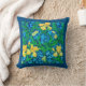 Kussen in een William Morris, Art Nouveau, textielprint van irissen en bladeren, digitaal versterkt en gekleurd, in goudgeel, groen en zacht blauw, op een diepe kobaltblauwe achtergrond