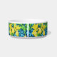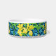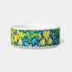 Pet bowl in een William Morris, Art Nouveau, textielprint van irissen en bladeren, digitaal versterkt en gekleurd, in goudgeel, groen en zacht blauw, op een diepe kobaltblauwe achtergrond