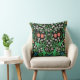Gooi kussen in een William Morris Jacobean bloembehang patroon van koraal roze tulpen, geel madeliefjes, blauw viooltjes, delicate witte bloesems, en jade groen gebladerte, op een zwarte achtergrond, digitaal versterkt en gekleurd