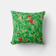 Gooi kussen in een William Morris Art Nouveau textielpatroon van lychee boomtakken en bladeren, in tinten van limoen en diepgroen, geaccentueerd met rode lychee vruchten en gele bloesems, op een lichtgroene achtergrond