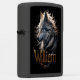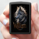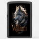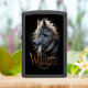 Een majestueuze wolf met doordringende gouden ogen staart zachtjes, zijn vacht stroomt als een door de wind gevlochten manen. De naam William is in een elegant gouden schrift gegrift onder de krachtige kop van de wolf. William The Wolf's Shadow