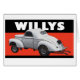 Digitaal herbewerkt afbeelding van een Willys van 1941 sleept racer op de achtergrond van rood en zwart met een groot wit woord 'WILLYS'.