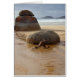 Deze foto van evenwichtige oranje mos bedekte rotsen op een ongerepte strand met water dat zachtjes over het zand stroomt met een achtergrond van een troebele en stormachtige hemel boven de oceaan creëer een zeer tranquilair, bevroren landschap. Pas uw eigen mantra, meditatiesprede of andere tekst aan voor een uniek ontwerp.
