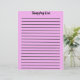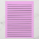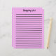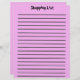 De titel en de lijnen van de Lijst van het kopen zijn op de voorzijde samen met een roze achtergrond. Op de achterkant is er een roze achtergrond met lijnen.