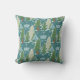 Een kleurrijk winterkussen met rood vossenpatroon met een blauwgroen blauw bos, sneeuwvlokken, wolken, groenblijvende besneeuwde bomen en kleine rode vossen!