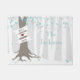 Een winterslaapsel met een illustratie van een sneeuwbos met een boom met blauwe, witte en zilverbladeren die rond de boomstam gewikkeld is. Pas de namen aan.