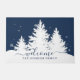 winterslaapsel met witte dennenbomen met sneeuw tegen een blauw marineschopende achtergrond. Welkom en naam van het script.